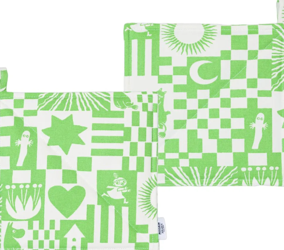 Få sommerstemning i køkkenet! Festkollektionens legende mønstre er baseret på tidlige mumimønstre fra 1950’erne med mange sjove elementer. Tilbered et lækkert måltid i stil med de livsglade mumier, og inviter dine nærmeste med til festen! Moomin Arabia-grydelapsæt, grøn, Fest