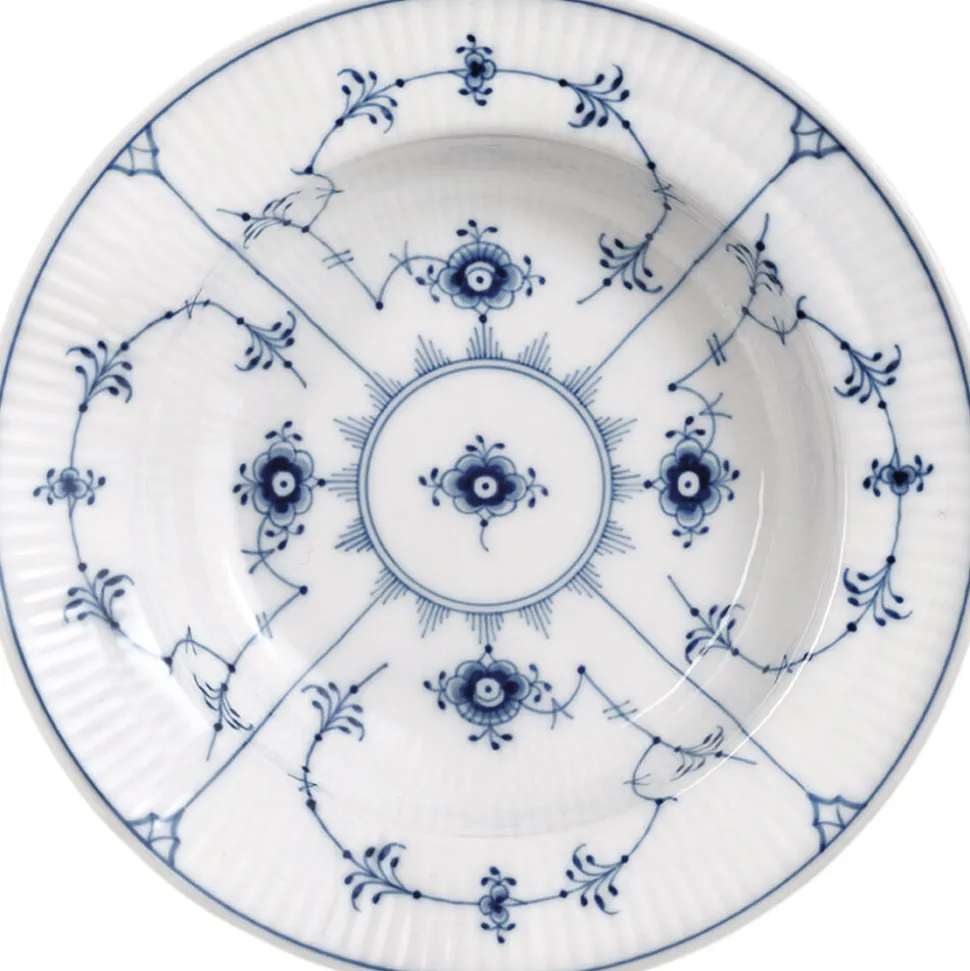Den nye 17 cm dyb tallerken i Musselmalet Riflet viser på fineste vis mønster nr.1 på en klassisk måde. Den dybe tallerken er perfekt til morgenmad, dessert eller som en forretstallerken. Den dybe tallerken er en re-introduktion af en tidligere Musselmalet Riflet form. Størrelsen på denne tallerken findes også i Blå Mega Riflet.