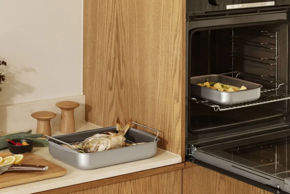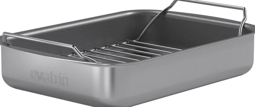 Uanset om I tilbereder grøntsager, steger grillkylling eller bager fisk leverer vores professionelle bradepande det perfekte resultat. Den slidstærke keramiske Slip-let®belægning (helt uden flourstoffer) sikrer, at maden slipper hurtigt og nemt, tåler op til 400 grader og gør rengøringen legende let. Den medfølgende stegerist sørger for, at kød og fjerkræ ligger plant og hævet over bunden. Når maden er færdig, sætter I bare fadet i opvaskemaskinen.