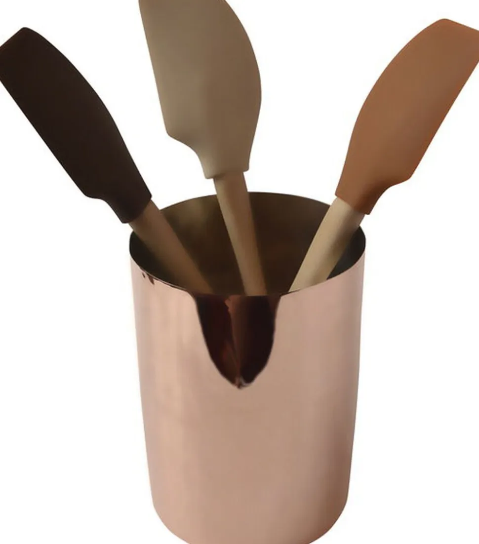 Redskabskrukke af børstet kobber i elegant fransk design. Opbevar dine grydeskeer, piskeris og dejskrabere med stil. Redskabskrukken fra Mauviel giver dig både praktisk opbevaring og et smukt designelement i køkkenet.(9999.23)