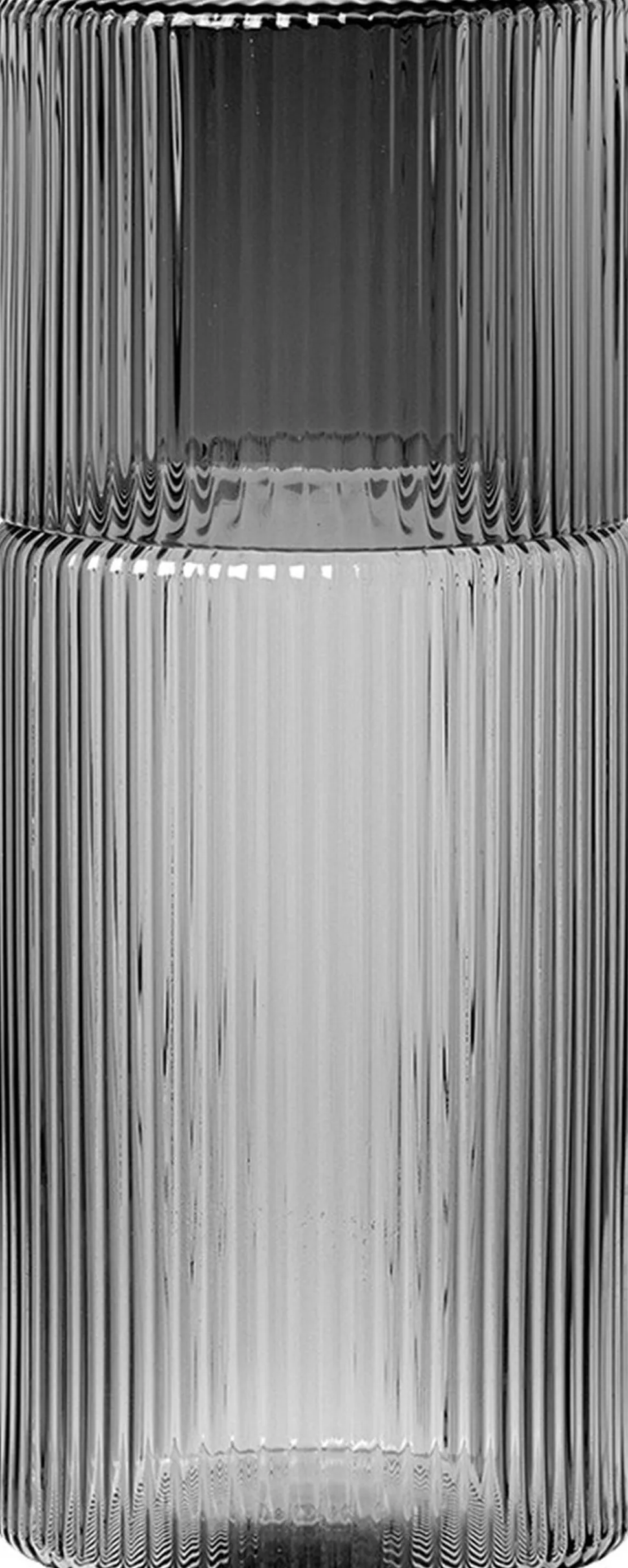 Sørg for at få nok vand hele dagen med dette smart sæt bestående af en lille karaffel og et glas, som også kan bruges som låg til karaflen. Sættet har dele seriens særlige karakteristika med sit let riflede og mundblæste glas i en smuk røgfarvet nuance. Det kan blive dit sunde kontortilbehør eller en ny favorit på sengebordet. Fås også i klart glas.
