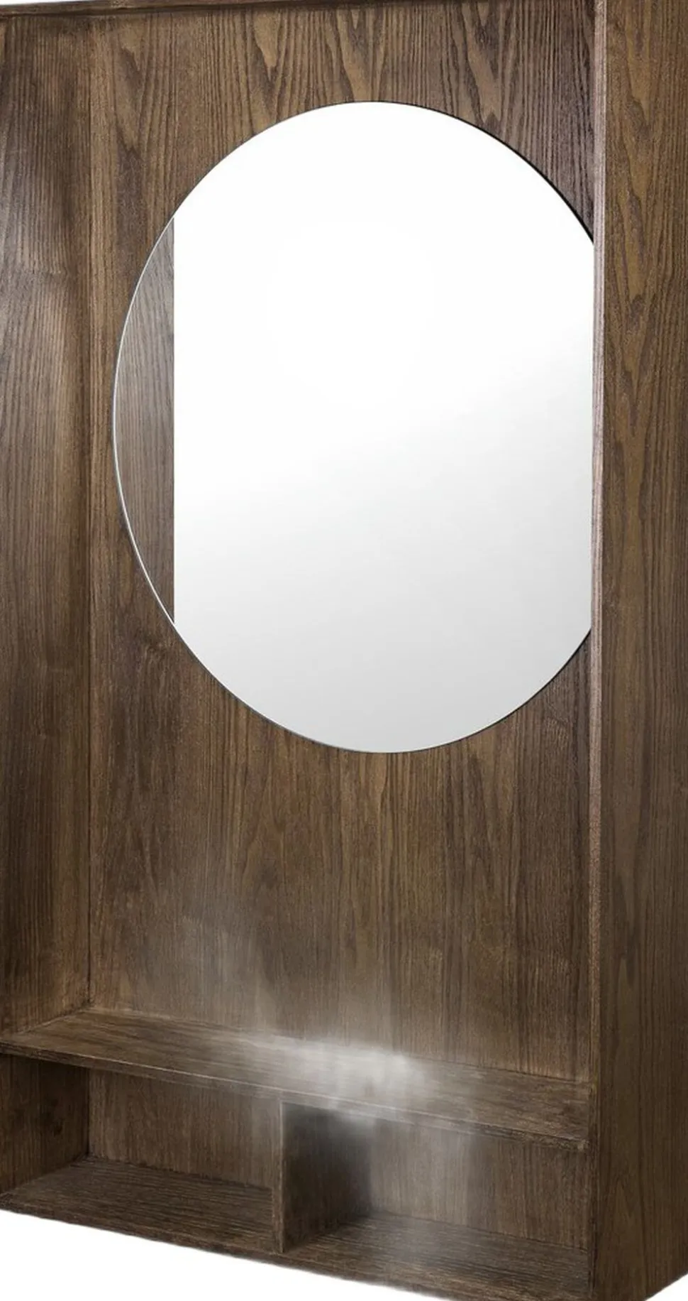 Et møbel med karakter. SHOWCASE mirror shelf er en nyfortolkning af 70ernes ikoniske spejlhylde nostalgisk i sit udtryk, men tilpasset moderne boligindretning. Det store, runde spejl kombineres med en hylde og to mindre rum i mørkolieret egetræsfiner og fungerer som både spejl og opbevaring. Brug det i entreen til nøgler og småting, eller i soveværelset som en dekorativ og praktisk detalje.