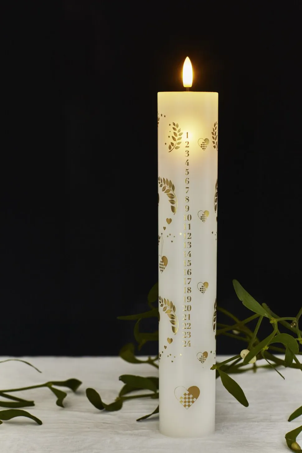 Voks kalenderlys med 3D flamme der lyser med et varmt hvidt lys. De 24 tal indikerer dagene til juleaften, der er integreret LED lys, som lyser ud for den ønsket dag. Der medfølger special fjernbetjening til lyset. Edition lyset laves kun i 2025 og leveres i en lækkergaveæske.