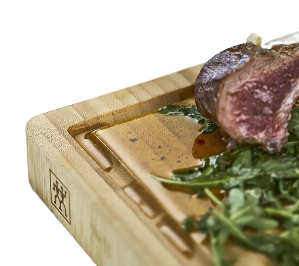 Et godt skæreunderlag til køkkenet skal være stabilt og let at rengøre, samtidig må det ikke bevirke at knivbladene slides for hurtigt. ZWILLING skærebrættet i bambus er optimalt hvad dette angår, og kan benyttes som underlag når der skal hakkes eller skæres alle typer madvarer. Brættet har saftrille på den ene side, men kan benyttes på begge. Bør kun vaskes af i håden i varmt vand, med et mildt opvaskemiddel og efterfølgende tørres stående. Må ikke udøttes for ekstreme temperaturer eller vedvarende fugt. Den naturlige farve på skærrebrættet bevares bedst ved regelmæssigt at behandle det med en neutral madolie.