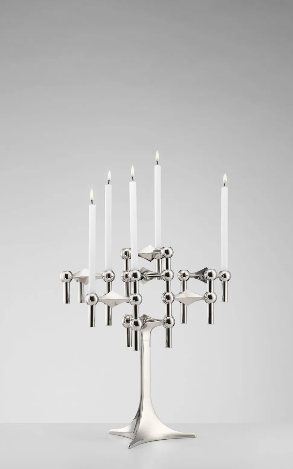 STOFF Nagel standeren er endnu en genopdagelse fra 60’erne. Den kan bruges alene eller med et antal STOFF Nagel lysestager og forvandles til din egen skulpturelle og ekstravagante kandelaber. STOFF Nagel standeren gør det muligt at være endnu mere kreativ og lave din egen personlige skulptur ved at placere lysestager og skåle på forskellige måder omkring standeren.