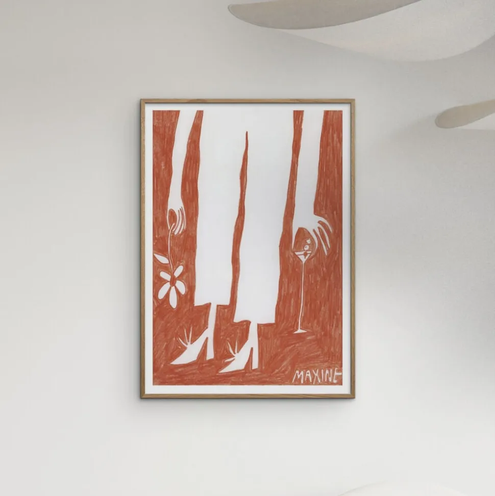 En stilfuld og minimalistisk plakat i varme, jordnære toner med et kunstnerisk motiv af hænder, en blomst og et cocktailglas. Dette moderne design emmer af elegance og attitude, perfekt til at skabe et iøjnefaldende udtryk i hjemmet. Ideel til stuen, gangen eller som gave til dem, der elsker grafisk kunst og unikt design. En tidsløs og chic tilføjelse til enhver væg.