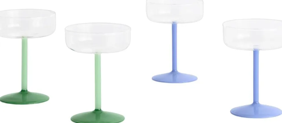 Tint Coupe Glass is a collection of elegant glasses made in tinted borosilicate glass. The classic coupe design features a long stem and shallow, broad bowl, making it suitable for serving champagne and cocktails, as well as ice cream, fruit or other desserts. The glasses come in sets of two.