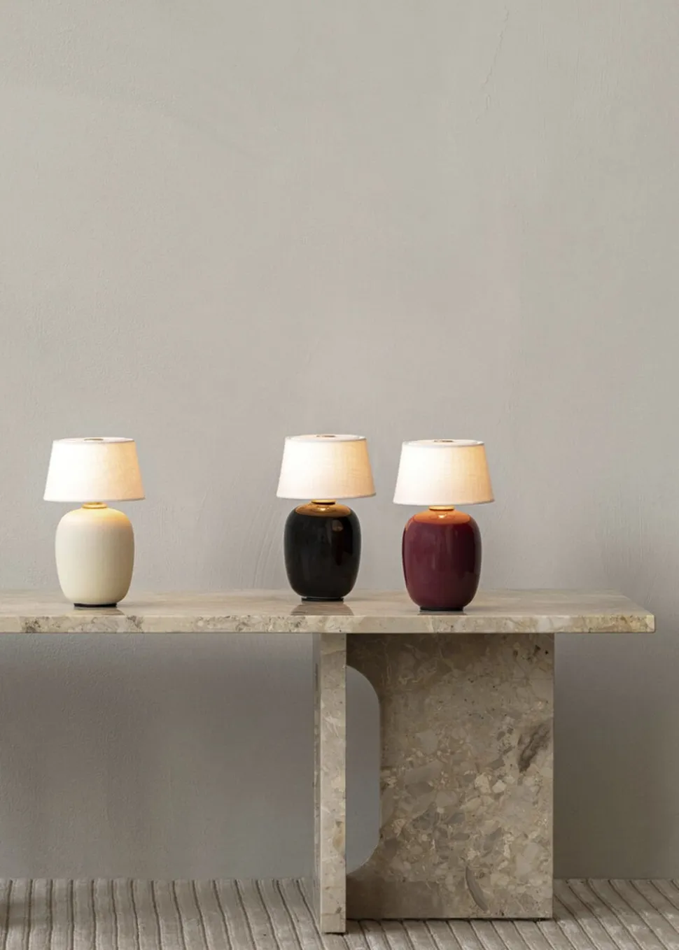 Krøyer-Sætter-Lassens bærbare bordlampe ‘Torso’ er en mindre version af den populære Torso-lampe i fuld størrelse. Denne lille, hyggelige lampe har evnen til at skabe en intim atmosfære og kan erstatte behovet for stearinlys med sit bløde og behagelige lys.