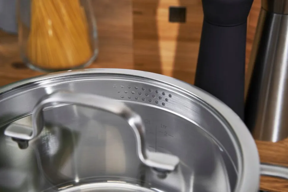 Takket være den integrerede påfyldningsskala er målebægre overflødige. Kasserollen, stegegryden og den store suppegryde tåler selvfølgelig opvaskemaskine og er kompatible med induktionskomfurer. Sættet indeholder 1 gryde (16 cm/2L), 1 gryde (20 cm/3L), 1 gryde (24 cm/6L), 1 suppegryde (20 cm/3,5L)