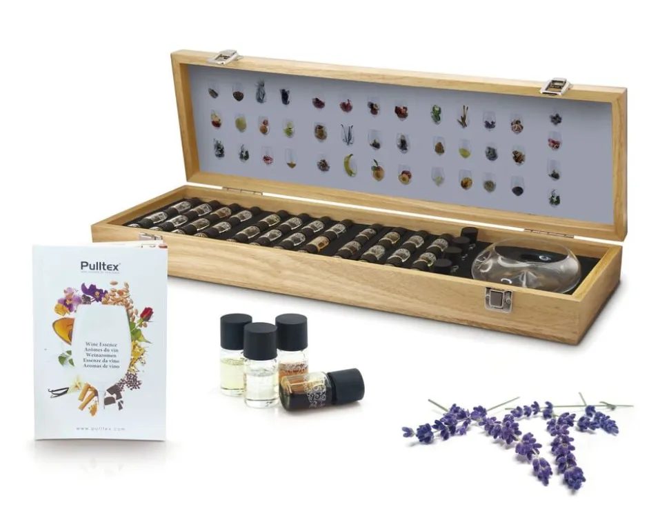 For at blive rigtig dygtig til at skelne dufte og smage i vin kræver det øvelse. Pulltex sæt med vinaromaer hjælper dig med at udvikle din lugtesans og gøre dig til en ægte vinkender. Sættet består af 12 flasker med dufte til rødvin, 12 flasker med dufte til hvidvin og 16 flasker til de mest komplekse aromaer. Det kommer i en smuk og praktisk træboks sammen med et glas til at teste med og et hæfte, der forklarer de forskellige aromaer.
