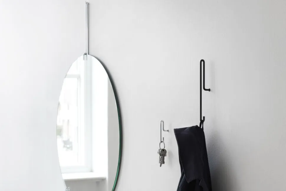 WALL HOOK by MOEBE er designet som et enkelt, kontinuerligt element. Knagen har to punkter, hvorpå man kan hænge sin jakke, nøgler, hat osv. Enten på toppen af den bøjet wire eller forneden på selve krogen. For at sikre en så simpel som muligt form, har vi valgt at spejlvende den normale knage, ved at lade selve krogen vende ind ad. På den måde får WALL HOOK by MOEBE en lukket og harmonisk form.