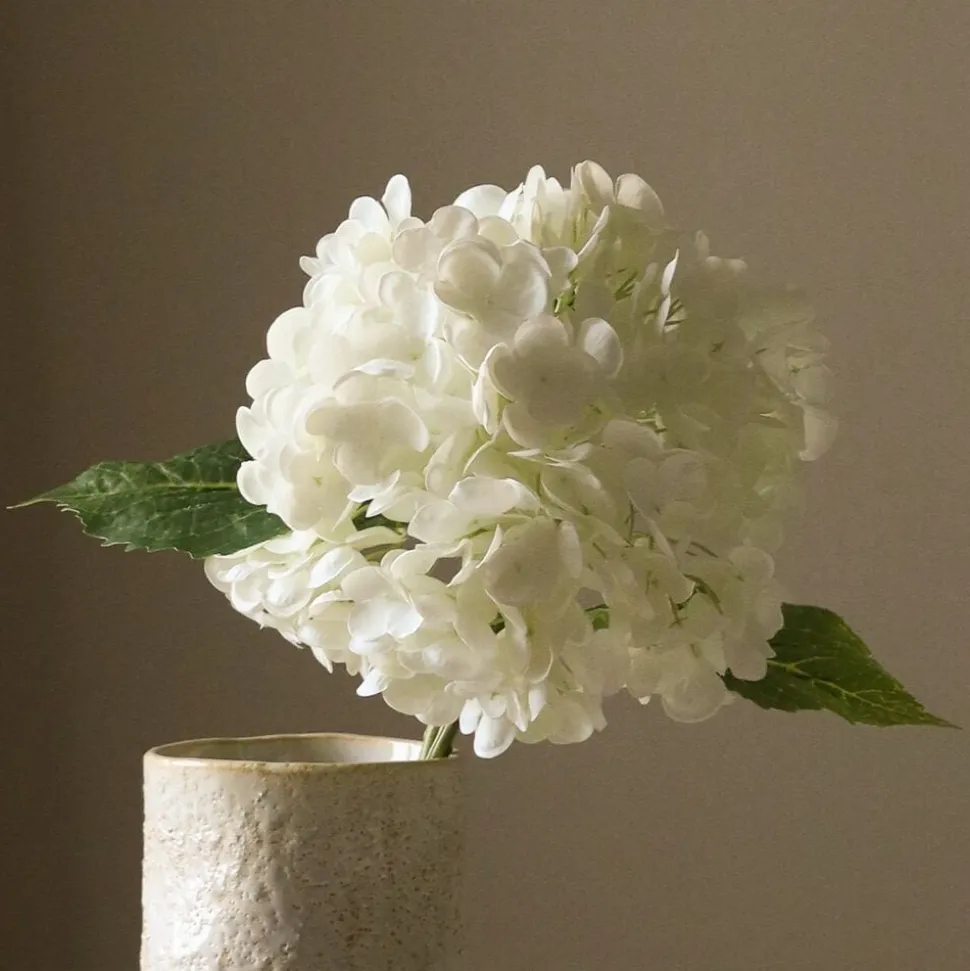 Denne White Hydrangea Flower har en Single stor blomst bestående af mange bløde, afrundede kronblade i en ren hvid nuance. Det fulde, klyngede blomsterhoved ledsages af to teksturerede grønne blade, der tilføjer kontrast til de glatte kronblade. Det strukturerede skaft, der når 49 cm i højden, giver en robust og elegant form.Ê Den store keramiske jordvase på billedet måler 30,5 cm i højden og 10 cm i diameter.
